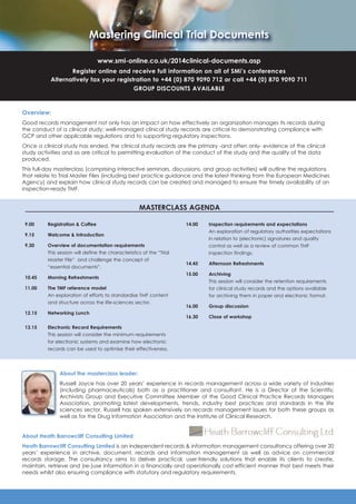This document provides information about an upcoming masterclass on mastering clinical trial documents. The masterclass will outline regulations related to the Trial Master File and explain how documents can be created and managed to ensure an inspection-ready file. Attendees will learn about documentation requirements, effective document management strategies, using records to enhance information sharing and facilitate operations, and improving inspection readiness to avoid burdensome preparations for audits. The full-day event will include presentations, discussions and activities on topics such as the Trial Master File reference model, electronic record requirements, inspection expectations, and archiving requirements and options.