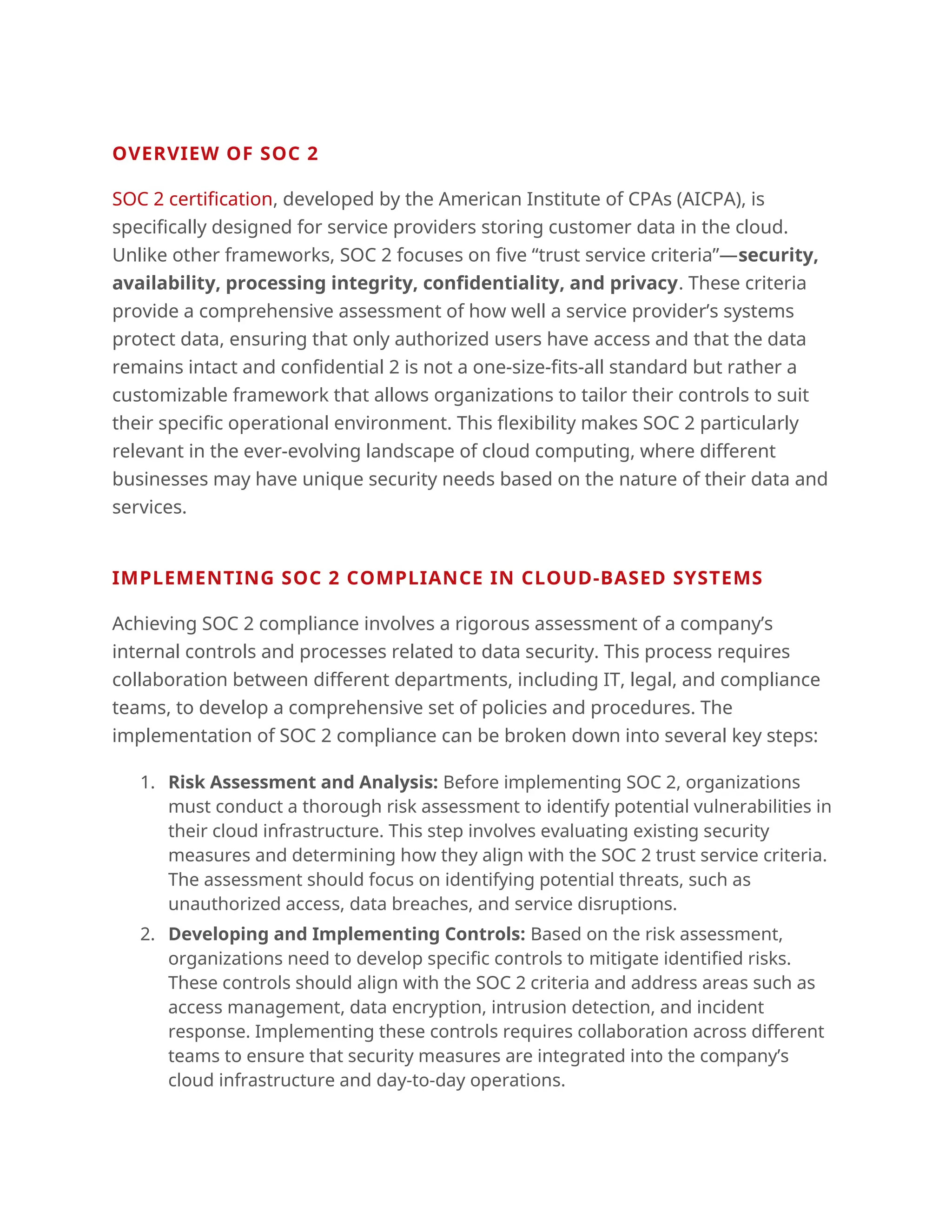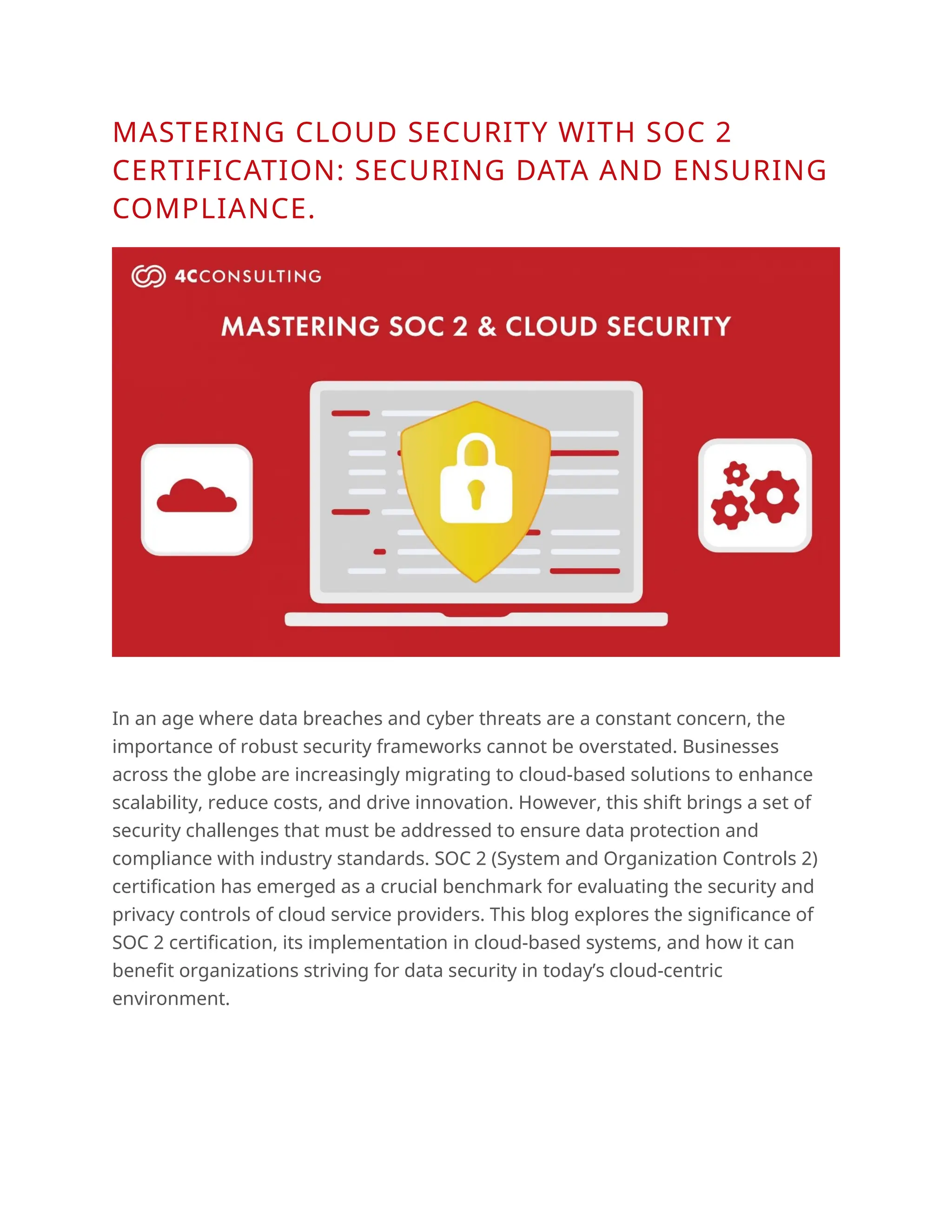 This document discusses the significance of SOC 2 certification for cloud service providers in ensuring data security and compliance amidst growing cyber threats. It outlines the steps for implementing SOC 2 compliance, including risk assessments, developing controls, and engaging third-party auditors, as well as the benefits such as enhanced trust, improved risk management, and operational efficiency. Additionally, it emphasizes that achieving SOC 2 certification is crucial for organizations looking to secure their cloud environments and gain a competitive edge.