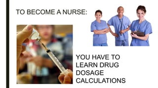 Mastering drug dosage calculations is important for nurses. There are multiple methods taught such as using formulas, proportions, unit cancellation, and logical reasoning. While formulas can be confusing, unit cancellation and logical reasoning help develop a deeper understanding of the calculations. Calculating dosages requires understanding basic math concepts regardless of the method used. Examples are provided demonstrating how to use unit cancellation to solve different types of dosage problems including basic drug calculations, IV rates, and calculations involving patient weight.