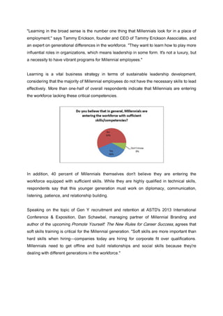 Millennials now make up a significant portion of the workforce but many are unprepared for leadership roles. While they have strong technical skills, Millennials often lack soft skills such as communication, diplomacy, and relationship building. In order to attract, retain, and develop Millennial talent into future leaders, companies need to offer specialized leadership training programs that focus on soft skills acquisition. The most effective organizations implement coaching and rotational programs to give Millennials exposure to different areas of the business and provide constant feedback to support their growth into leadership.