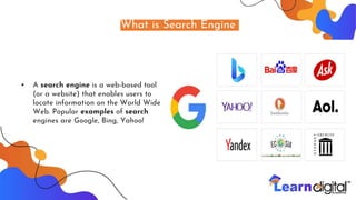 The document explains the function and components of search engines and provides a comprehensive overview of Search Engine Optimization (SEO) techniques, including on-page and off-page strategies. It covers key elements such as keyword placement, meta tags, URL structure, and content optimization while addressing SEO practices like avoiding duplicate content and managing broken links. Additionally, it highlights the importance of ranking factors, tools, and techniques to enhance website visibility and traffic through effective SEO methods.