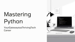 Explore the world of programming with Mastering Python, a comprehensive presentation that helps learners understand Python from basics to advanced concepts. This PPT covers syntax, libraries, data handling, and real-world applications in AI, Data Science, and Automation.