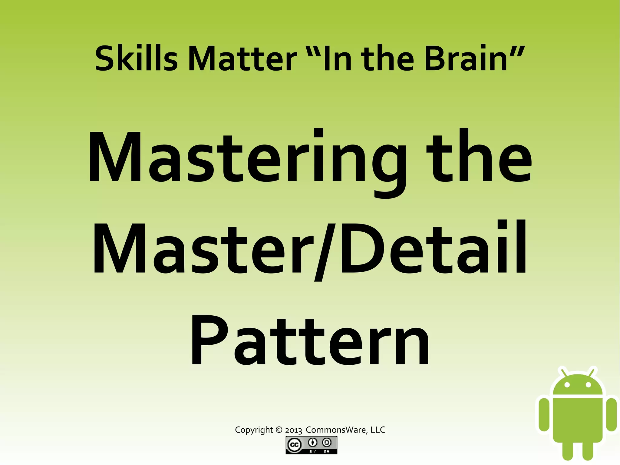 The document discusses the master/detail pattern in Android development, detailing its implementation through templates, fragments, and layouts for different screen sizes. It covers pros and cons of using a single activity with fragments, the use of the SlidingPaneLayout and ViewPager for navigation, and action modes for contextual actions. Additionally, it highlights best practices and future functionality in the cwac-masterdetail library for efficient implementation.