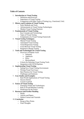 The document provides a comprehensive overview of visual testing in software quality assurance, highlighting its importance for ensuring a visually consistent user experience across different devices and platforms. It covers the history, fundamentals, techniques, tools, and practices of visual testing, emphasizing the shift from manual to automated methods and the integration of visual testing into CI/CD pipelines. The document also discusses emerging trends, challenges, and real-world applications, underscoring the necessity of visual testing as software continues to evolve.