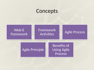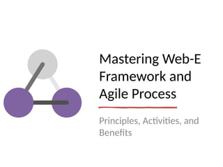The document outlines the Web-E framework and Agile process principles, emphasizing their activities and benefits in web engineering projects. Key Web-E framework activities include communication, planning, modeling, construction, and deployment, while Agile processes prioritize continuous delivery, customer satisfaction, and adaptability to change. The Agile approach promotes a sustainable development environment and helps teams focus on rapid delivery and optimizing value.