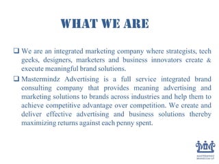 Mastermindz Advertising is a full-service integrated marketing firm that provides strategic brand consulting and advertising solutions. It creates effective advertising campaigns and business solutions to help clients achieve competitive advantages. The company offers various services including media planning, public relations, social media marketing, events, branding, digital marketing, market research, product launches, and more. It works with clients across different industries to optimize awareness and maximize returns on marketing investments.