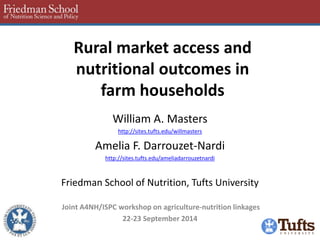 This document summarizes two studies on the relationship between rural market access and nutritional outcomes in farm households. The global study found that subnational regions with a longer history of urbanization had children with better heights and weights, indicating market access can improve nutrition. The DRC study found proximity to towns protected against negative impacts of seasonal shocks on child nutrition, demonstrating market access enhances resilience. Overall, the results suggest facilitating market access for farm households can raise nutritional status and improve resilience to shocks.