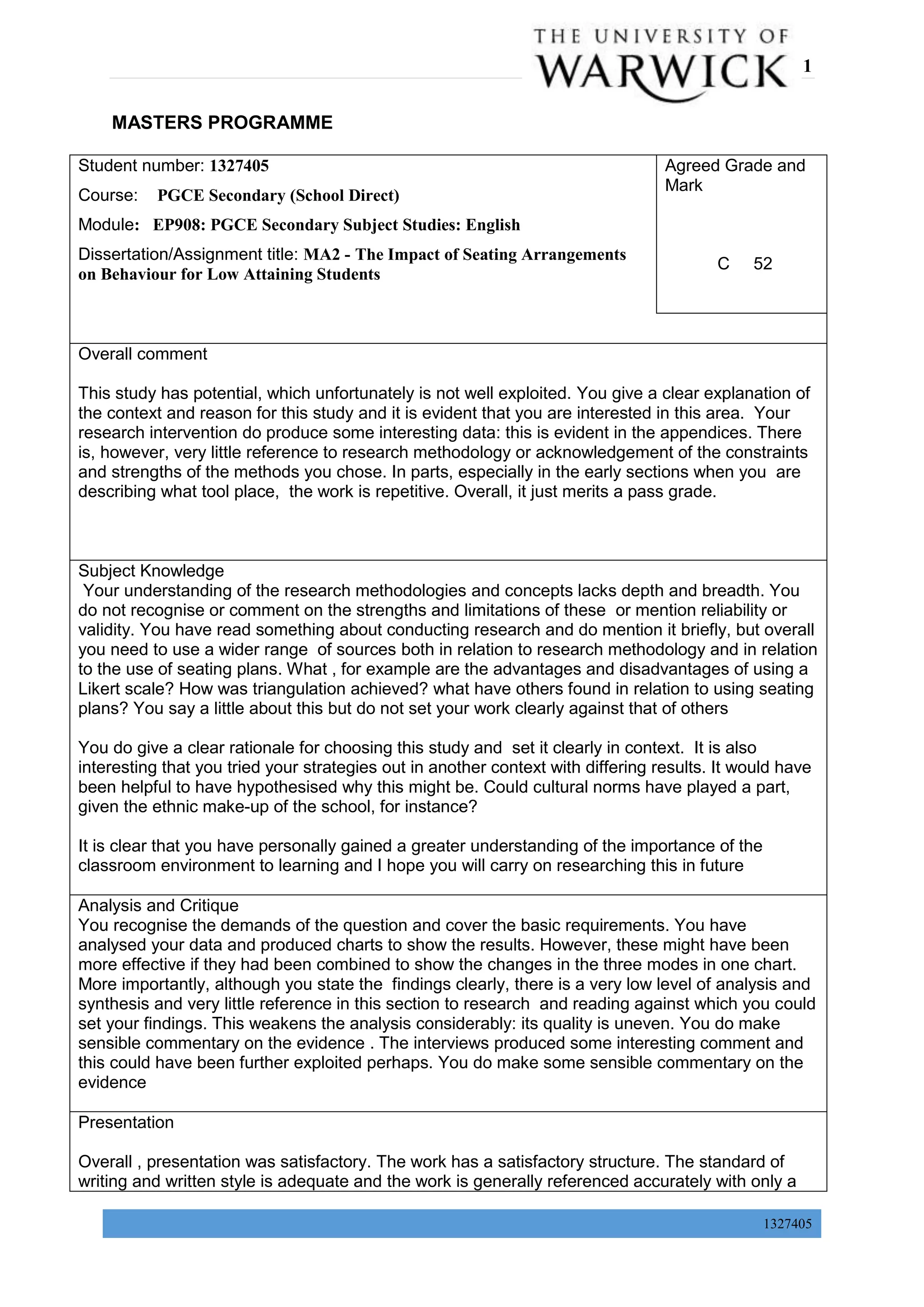 This study examined the impact of different seating arrangements on student behavior in a low-attaining English class. The researcher observed the class over twelve lessons with three different seating configurations: enforcing the school's standard boy-girl arrangement, seating students by ability, and allowing free seating choice. Data was collected through observations, student questionnaires, and focus groups. Overall, the study found some interesting results regarding changes in student behavior and work output under the different arrangements, though the analysis could have been strengthened by more direct comparison to previous research findings and deeper discussion of the limitations of the study methods. The researcher aims to present these findings to school leadership to inform classroom seating policies.
