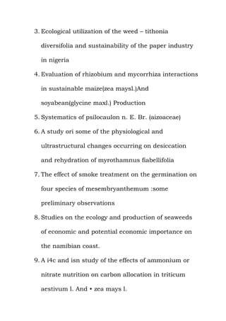 This document provides 70 potential topics for a Masters project in Botany. It includes topics such as ethnobotanical studies, plant ecology, phytoplankton dynamics, fungal pathogens of plants, plant systematics, and plant physiology. It also provides information on how to purchase the abstract, table of contents, and first chapter of a selected topic, as well as instructions for full project development and payment details.