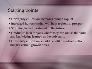 This document analyzes the regional mobility patterns of Finnish university Master's degree graduates five years after graduation. It finds that while many graduates remain in or return to their home region, there is also significant migration, especially to cities and the Southern Finland province. Only 12% of graduates who moved for university were employed in the university's province 5 years later, indicating brain drain impacts for some regions. While increased education benefits individuals, its concentration in Southern Finland may not benefit the whole nation equally.