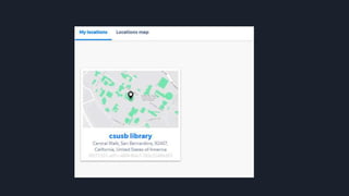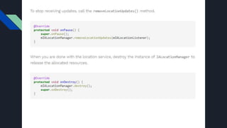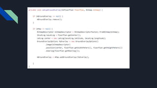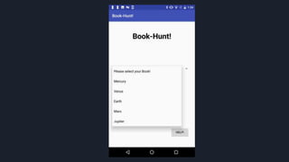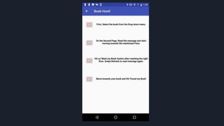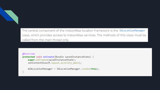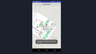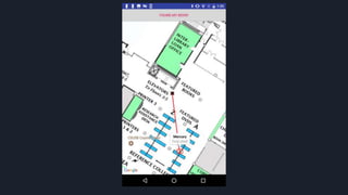 Sneha Pantam presented on her Book-Hunt! Android mobile application for indoor navigation in libraries. The application uses the IndoorAtlas platform for indoor positioning and Google Maps Android API to display floor plans and locate users and books. It plots the user's location on the floor plan, places a marker at the book's location, and draws a polyline between them to guide the user to the book. The presentation covered the software architecture, how IndoorAtlas works using sensors and positioning systems, setting up credentials, and key classes and functions used from the IndoorAtlas SDK and Google Maps API.