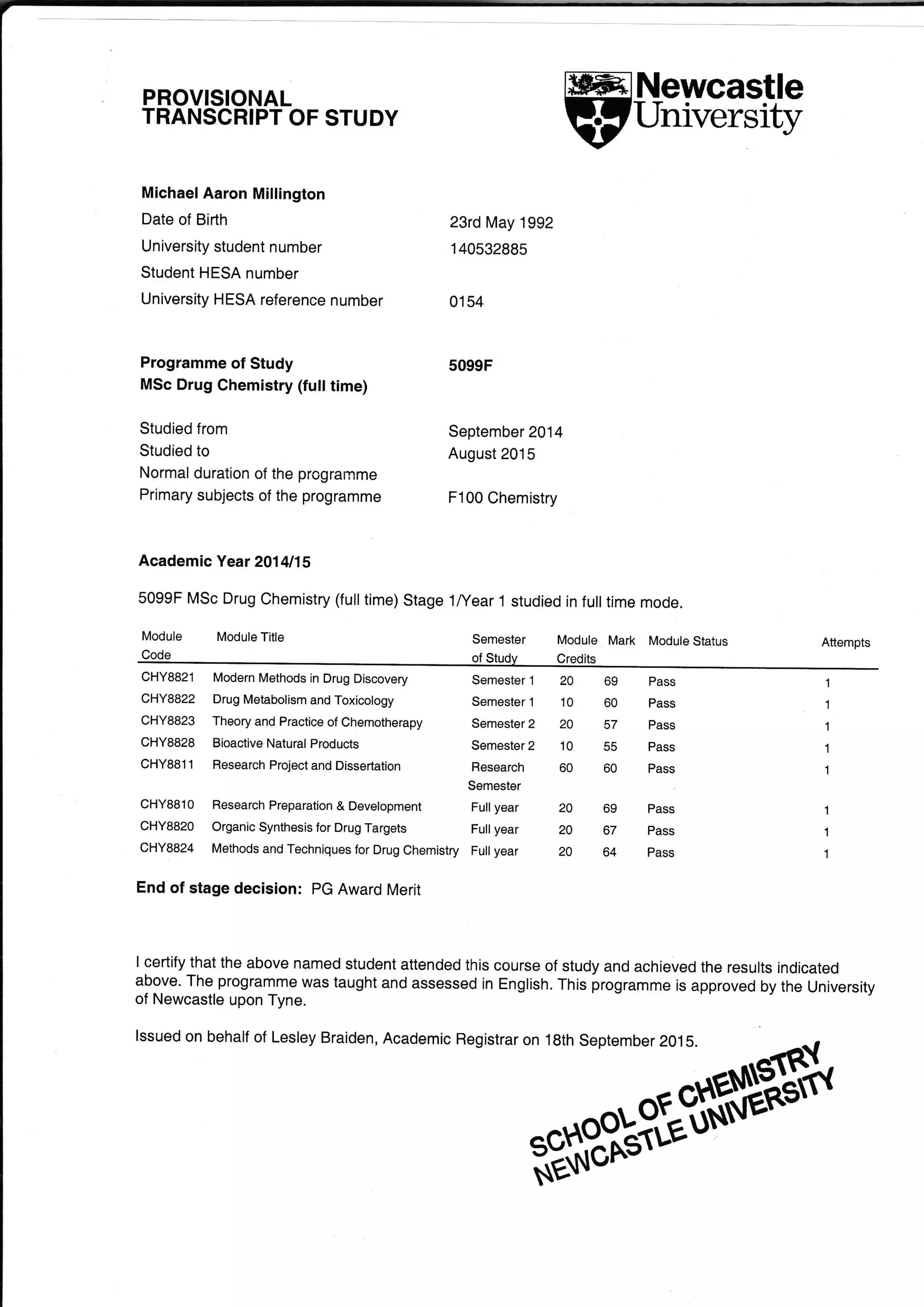 Michael Aaron Millington studied a one-year full-time MSc in Drug Chemistry at Newcastle University from September 2014 to August 2015. He successfully completed eight modules in the first semester and four modules spanning the full academic year, achieving marks ranging from 55 to 69. The transcript certifies that Millington attended the program and achieved the results indicated, which were taught and assessed in English for a program approved by Newcastle University.