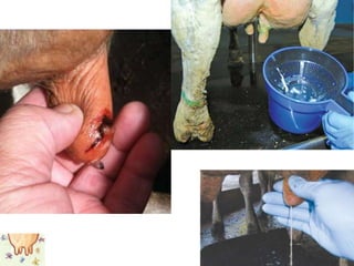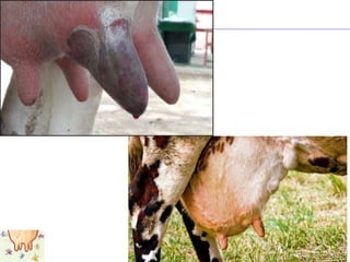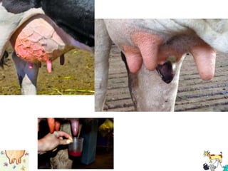 Mastitis is an inflammation of the mammary gland that can be clinical or subclinical. It is caused most commonly by bacterial infections entering through the teat canal. The main forms of mastitis are contagious (spreads from cow to cow) and environmental (from bedding, manure, etc.). Mastitis results in significant economic losses due to decreased milk production, treatment costs, and increased cow culling. While clinical mastitis shows visible signs like abnormal milk and udder inflammation, subclinical mastitis is more prevalent but only detectable through milk testing.