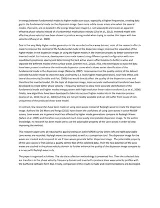 This document discusses using Love waves in active Multichannel Analysis of Surface Waves (MASW) surveys to improve data quality. It proposes recording both left and right polarized Love waves in addition to Rayleigh waves. The polarization of Love waves could help quality control data collection. Stacking the polarized Love waves in the phase velocity domain may enhance the dispersion image compared to using Rayleigh waves alone. The paper aims to test this approach on a field site and compare the shear wave velocity profiles obtained from inverting Love wave and Rayleigh wave dispersion data. References are provided on research related to improving MASW surveys through better handling of higher surface wave modes.