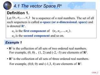 This document defines key concepts in linear algebra including vector spaces, vectors, and operations on vectors such as addition and scalar multiplication. It specifically focuses on the vector space Rn: