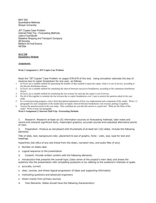 This document outlines the assignments for the Quantitative Methods course MAT 540 at Strayer University. It includes case problems and assignments on forecasting methods, linear programming, and transportation modeling. The assignments involve using simulation and linear programming to model scenarios and make recommendations. Students are asked to formulate models, solve them to analyze scenarios, and provide written analysis and recommendations based on the results.