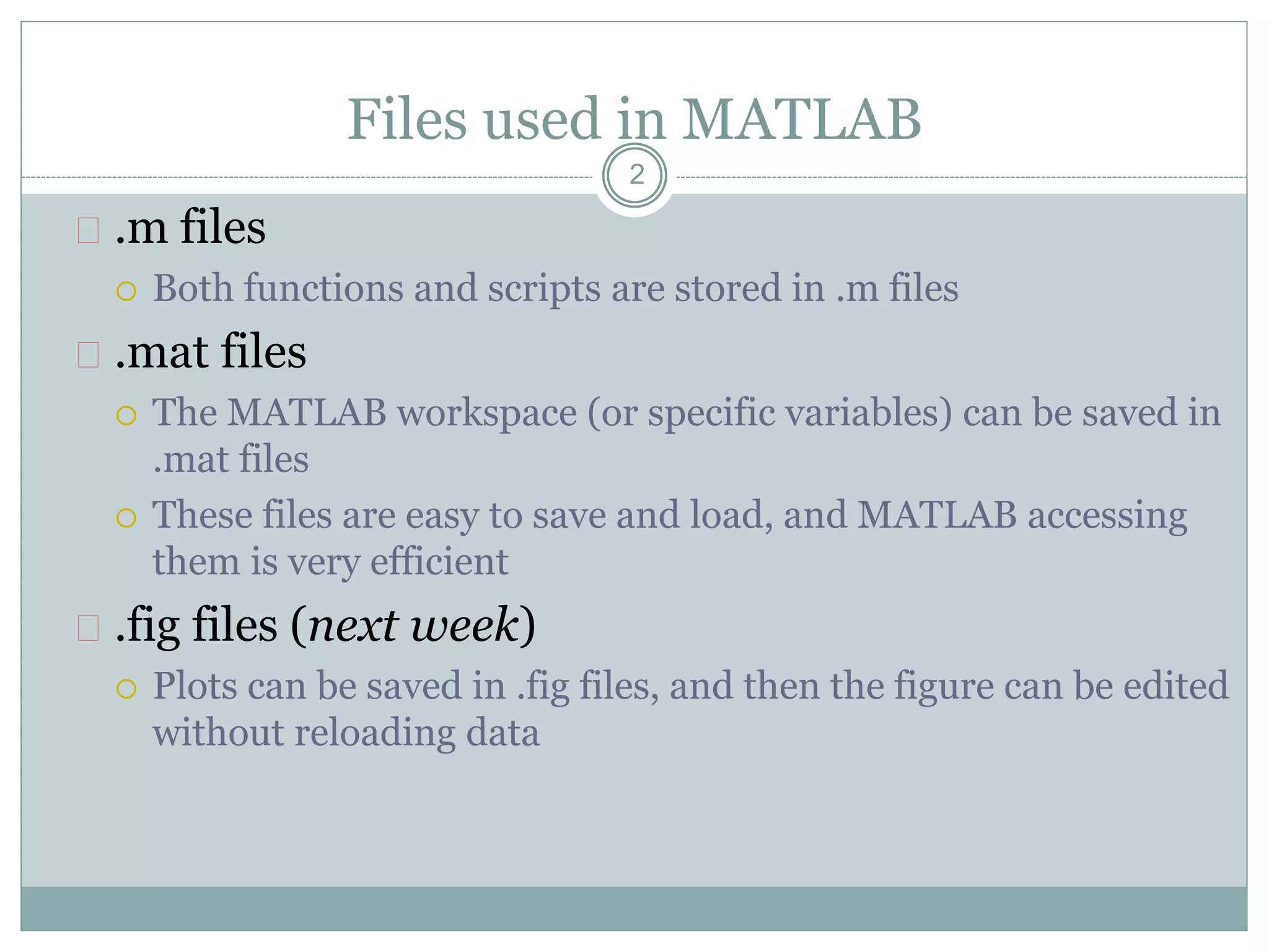 1) Functions and scripts are stored in .m files. The MATLAB workspace can be saved in .mat files for easy loading and efficient access. Plots can be saved in .fig files.