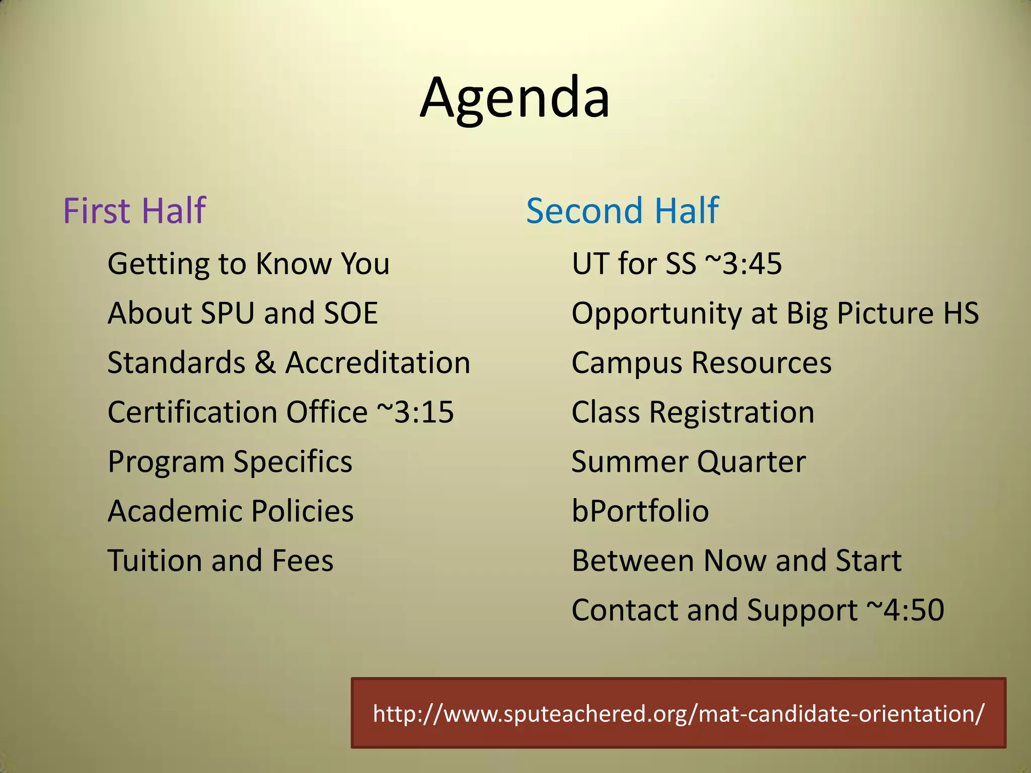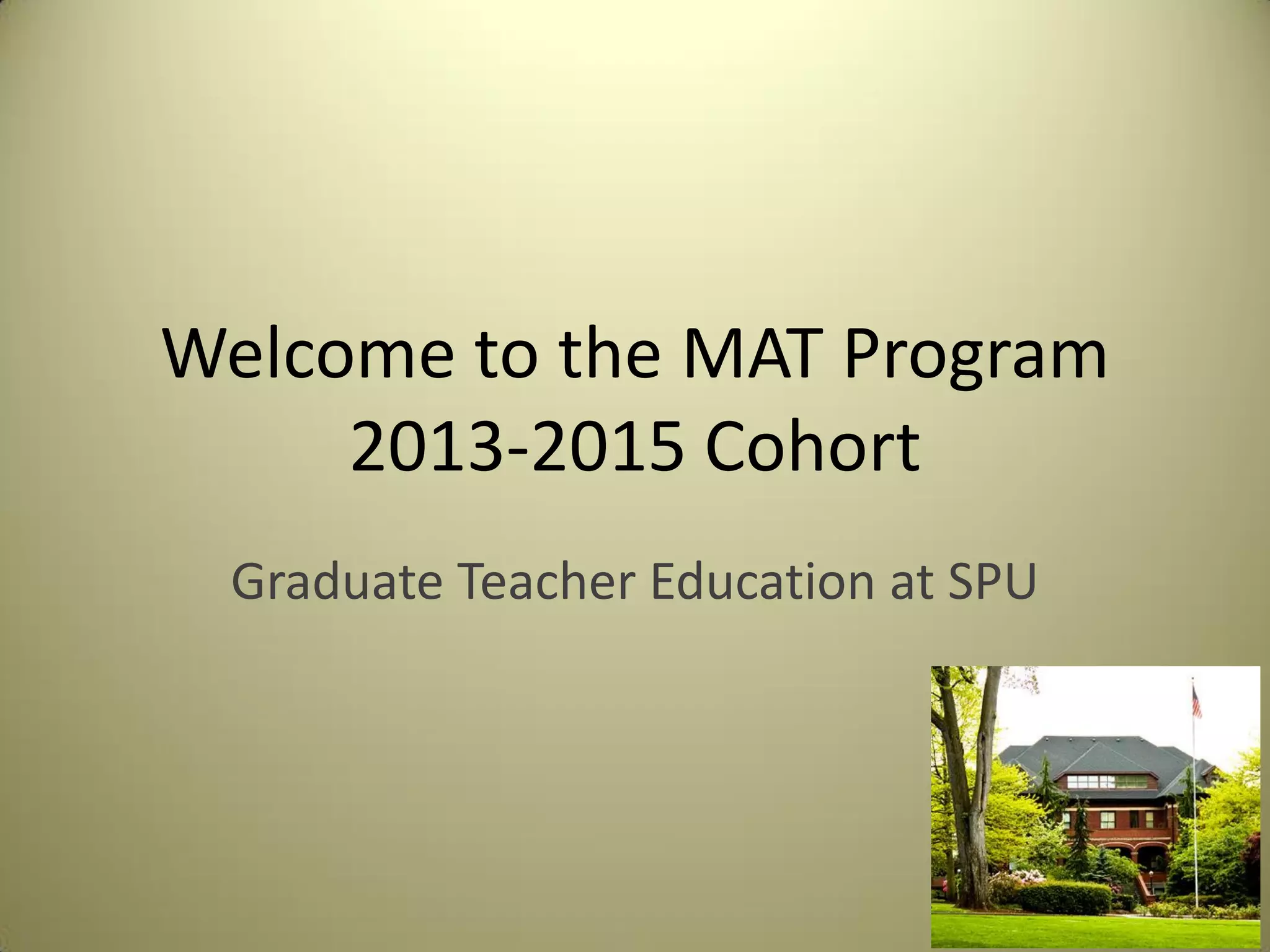 This document outlines the orientation for a Master of Arts in Teaching (MAT) program cohort from 2013-2015. It includes an agenda covering an introduction to Seattle Pacific University's School of Education, the MAT program requirements and standards, course sequences, internship information, assessments, resources and academic policies. Students are provided details on creating an online portfolio, registering for classes, and next steps to complete before the start of the program. The orientation aims to prepare students for the MAT program and certification requirements.