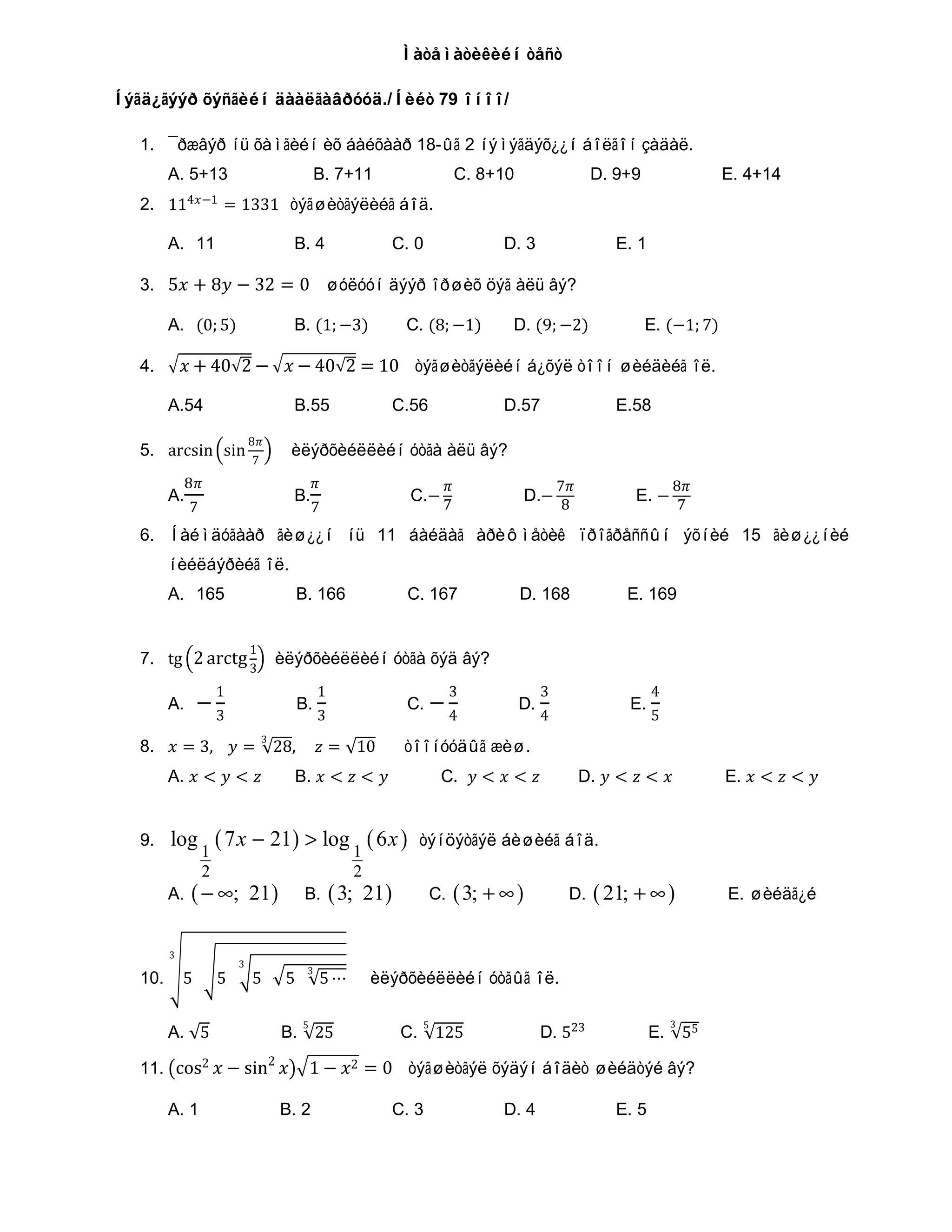 äààëãàâðóóä./Íèéò 79 îíîî/ 1. ¯ðæâýð íü õàìãèéí èõ áàéõààð 18-ûã 2 íýìýãäýõ¿¿í áîëãîí çàäàë. 2. 114𝑥𝑥−1 = 1331 òýãøèòãýëèéã áîä. A. 5+13 B. 7+11 C. 8+10 D. 9+9 E. 4+14 3. 5𝑥𝑥 + 8𝑦𝑦 − 32 = 0 øóëóóí äýýð îðøèõ öýã àëü âý? A. 11 B. 4 C. 0 D. 3 E. 1 A. (0; 5) B. (1; −3) C. (8; −1) D. (9; −2) E. (−1; 7) 4. � 𝑥𝑥 + 40√2 − � 𝑥𝑥 − 40√2 = 10 òýãøèòãýëèéí á¿õýë òîîí øèéäèéã îë. A.54 B.55 C.56 D.57 E.58 5. arcsin �sin � 8𝜋𝜋 7 8𝜋𝜋 𝜋𝜋 𝜋𝜋 7𝜋𝜋 8𝜋𝜋 èëýðõèéëëèéí óòãà àëü âý? E. − 7 7 7 8 7 A. B. C.− D.− 6. Íàéìäóãààð ãèø¿¿í íü 11 áàéäàã àðèôìåòèê ïðîãðåññûí ýõíèé 15 ãèø¿¿íèé íèéëáýðèéã îë. A. 165 B. 166 C. 167 D. 168 E. 169 7. tg �2 arctg 3� èëýðõèéëëèéí óòãà õýä âý? 1 − C. − 1 1 3 3 4 3 3 4 4 5 A. B. D. E. 8. 𝑥𝑥 = 3, 𝑦𝑦 = √28, 𝑧𝑧 = √10 3 A. 𝑥𝑥 < 𝑦𝑦 < 𝑧𝑧 B. 𝑥𝑥 < 𝑧𝑧 < 𝑦𝑦 C. 𝑦𝑦 < 𝑥𝑥 < 𝑧𝑧 D. 𝑦𝑦 < 𝑧𝑧 < 𝑥𝑥 E. 𝑥𝑥 < 𝑧𝑧 < 𝑦𝑦 òîîíóóäûã æèø. 9. log ( 7 x − 21) > log ( 6 x ) òýíöýòãýë áèøèéã áîä. 1 1 2 2 A. ( − ∞; 21) B. ( 3; 21) C. ( 3; + ∞ ) D. ( 21; + ∞ ) E. øèéäã¿é 10. �5 �5 �5 �5 √5 ⋯ 3 3 3 èëýðõèéëëèéí óòãûã îë. A. √5 B. √25 C. √125 D. 523 E. √55 5 5 3 11. �cos2 𝑥𝑥 − sin2 𝑥𝑥��1 − 𝑥𝑥2 = 0 òýãøèòãýë õýäýí áîäèò øèéäòýé âý? A. 1 B. 2 C. 3 D. 4 E. 5