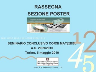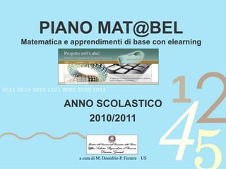 Il documento presenta il piano mat@bel per l'insegnamento della matematica e delle competenze di base tramite elearning per l'anno scolastico 2010/2011. Include una rassegna e un poster del seminario conclusivo dei corsi mat@bel dell'anno scolastico precedente, tenutosi a Torino il 5 maggio 2010. La documentazione accoglie i partecipanti all'edizione mat@bel per l'anno successivo.