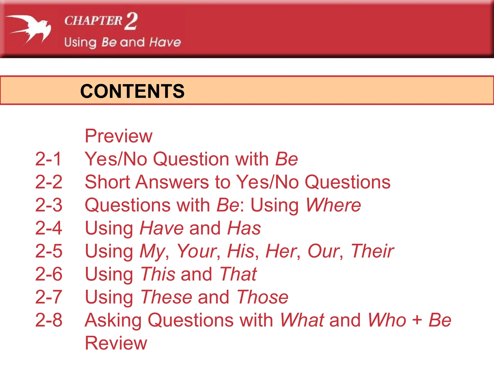 The document provides a comprehensive review of basic English grammar concepts, focusing on questions, short answers, and the usage of verbs 'be', 'have', and possessive adjectives. It includes various exercises and practices to reinforce learning about asking questions, forming statements, and identifying subjects and objects. The chapters cover different grammatical structures with examples for clarity and practice, aimed at enhancing language skills.
