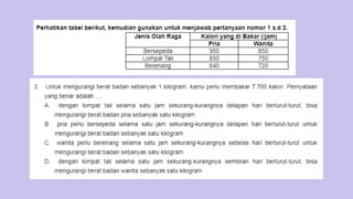 Dokumen ini membahas tentang konsep dasar untung dan rugi dalam transaksi jual beli dan perhitungan terkait, termasuk harga pembelian, harga penjualan, serta rumus untuk menghitung laba atau kerugian. Selain itu, terdapat contoh soal mengenai diskon, pajak penghasilan, serta perhitungan bunga dan berat barang. Dokumen ini juga menyajikan penjelasan mengenai perbandingan dan skala peta.