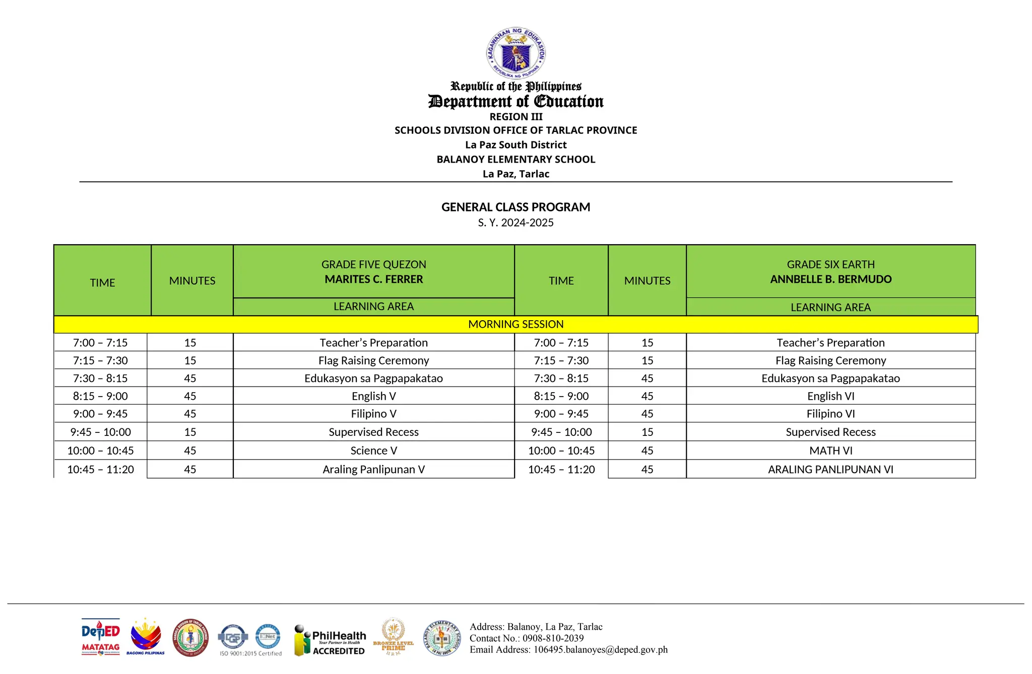 The document outlines the daily schedules for Grade V and Grade VI students at Balanoy Elementary School for the school year 2024-2025, detailing morning and afternoon sessions with time allocations for various subjects. It includes teacher preparation times, flag raising ceremonies, recess periods, and classes in subjects such as Edukasyon sa Pagpapakatao, English, Filipino, Science, and Mathematics. The schedules were prepared by Jackie Lou Ronquillo-Bruno, reviewed and approved by respective authorities, and include contact details for the school.