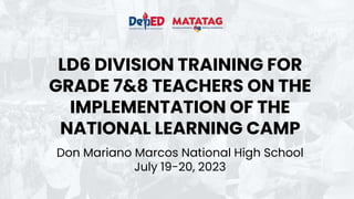 The document outlines a training event for grade 7 and 8 teachers focused on implementing the National Learning Camp held at Don Mariano Marcos National High School on July 19-20, 2023. It includes details of the agenda, featuring opening remarks and plenary sessions led by various participants. The document highlights the importance of collaboration and learning for educational improvement.