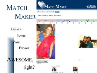 The document discusses the transition from Match Maker to Squeeze Me, a new 1-to-1 action model mobile app. It provides growth trend data showing Squeeze Me doubled its users in the last week to 40,000 users in four weeks. A mathematical model found the number of new users is directly proportional to the number of squeezes sent the same day. The document invites questions about their growth methods and targeting Squeeze Me's primary demographic of 30-50 year olds from the UK, Canada, US, and Australia.