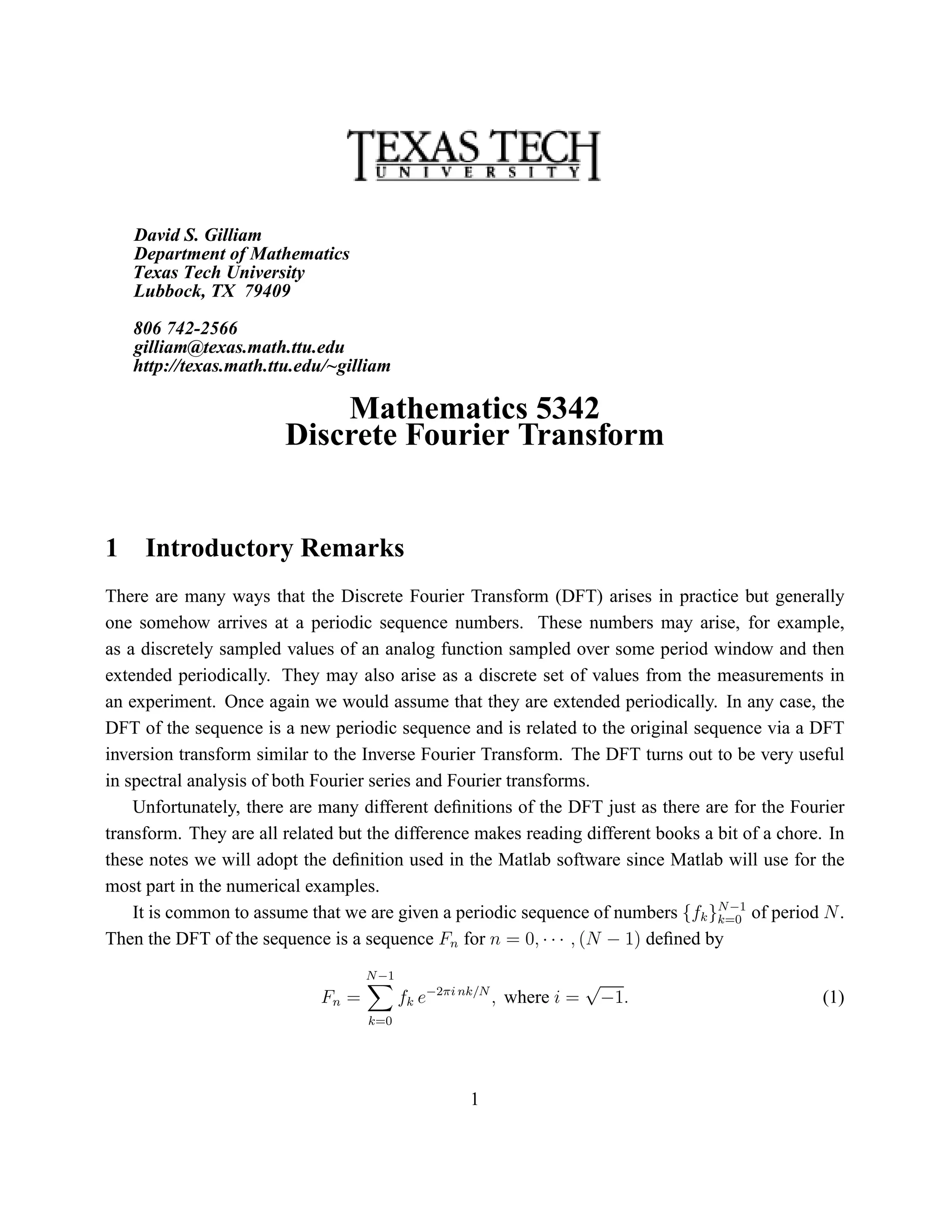 This document provides an introduction to the Discrete Fourier Transform (DFT) including its definition, relationship to the continuous Fourier transform and Fourier series, and examples of its computation and applications. Specifically: