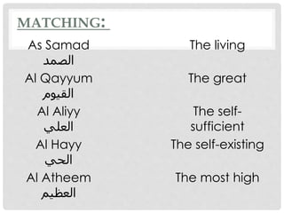 This document lists 6 names or attributes of God in Arabic with their English translations. The names provided are: As-Samad meaning The eternal, Al-Qayyum meaning The self-existing, Al-Aliyy meaning The most high, Al-Hayy meaning The living, Al-Atheem meaning The great, and Al-Hayy meaning The self-sufficient.