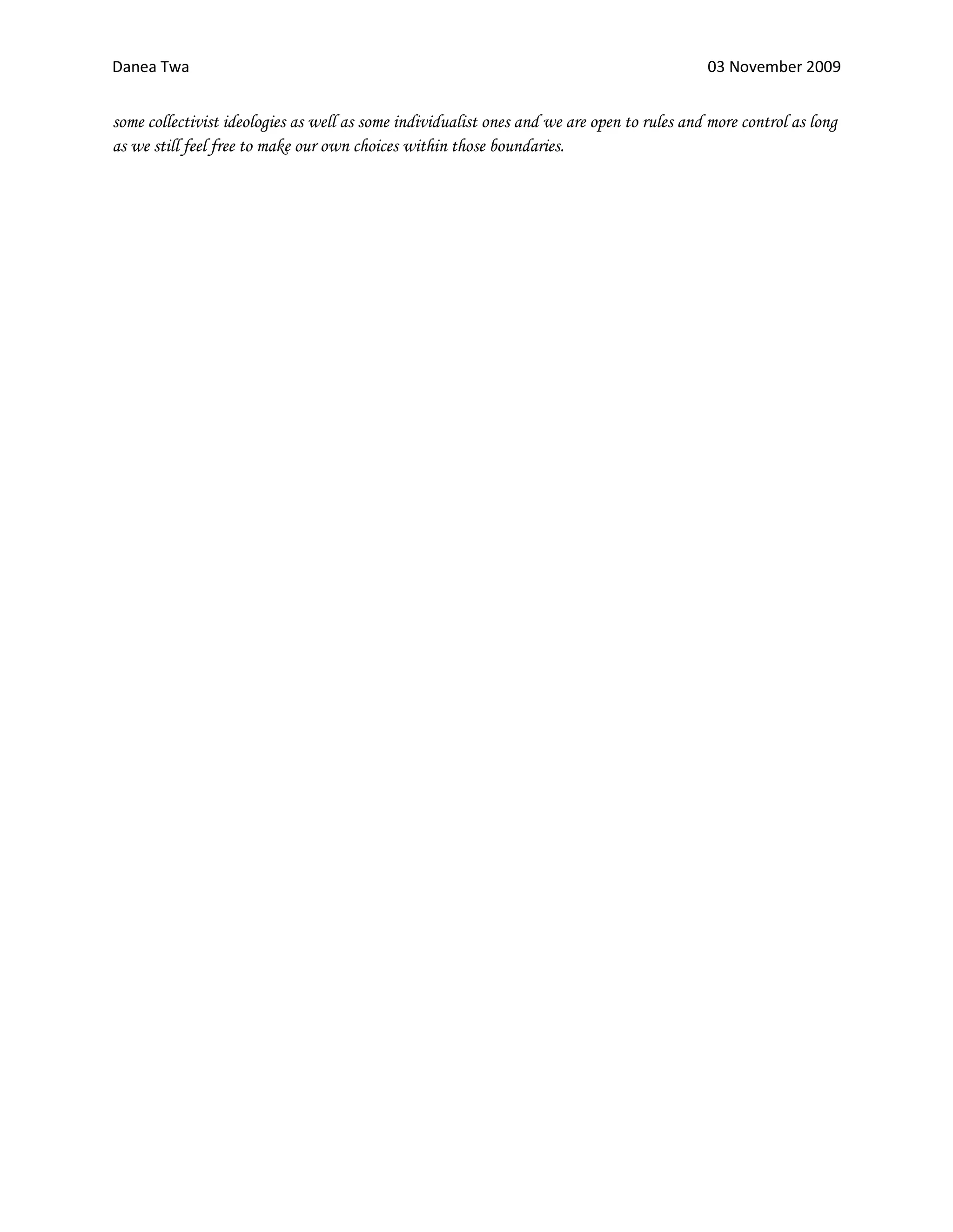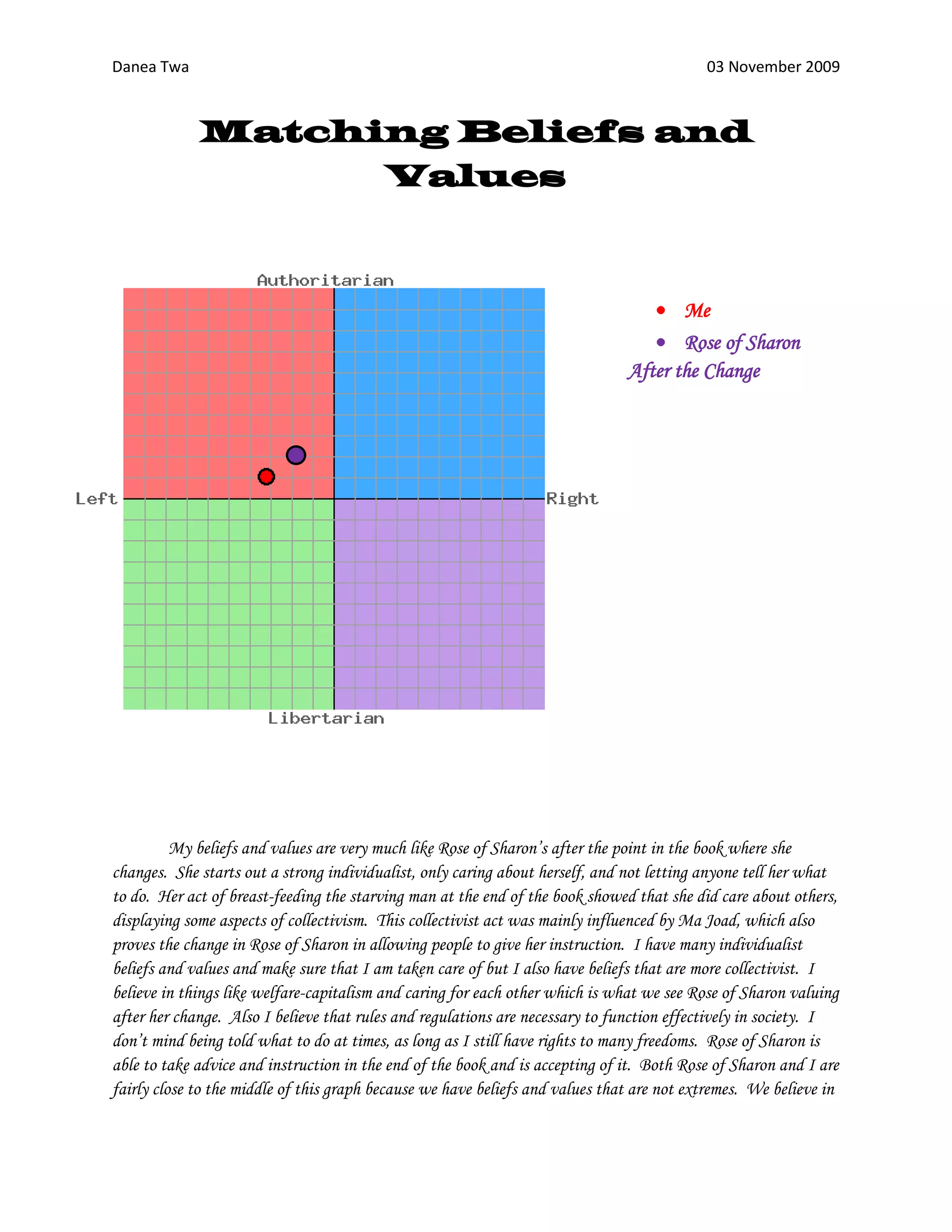 The document compares the author's beliefs and values to those of the character Rose of Sharon from the novel The Grapes of Wrath. It states that initially Rose of Sharon only cared for herself and did not want others telling her what to do, representing individualist beliefs. However, by breastfeeding a starving man at the end of the novel, she displayed more collectivist values in caring for others, influenced by her mother Ma Joad. Both the author and Rose of Sharon hold a mix of individualist and collectivist views, supporting some social welfare programs and regulations while also valuing personal freedoms and independence.
