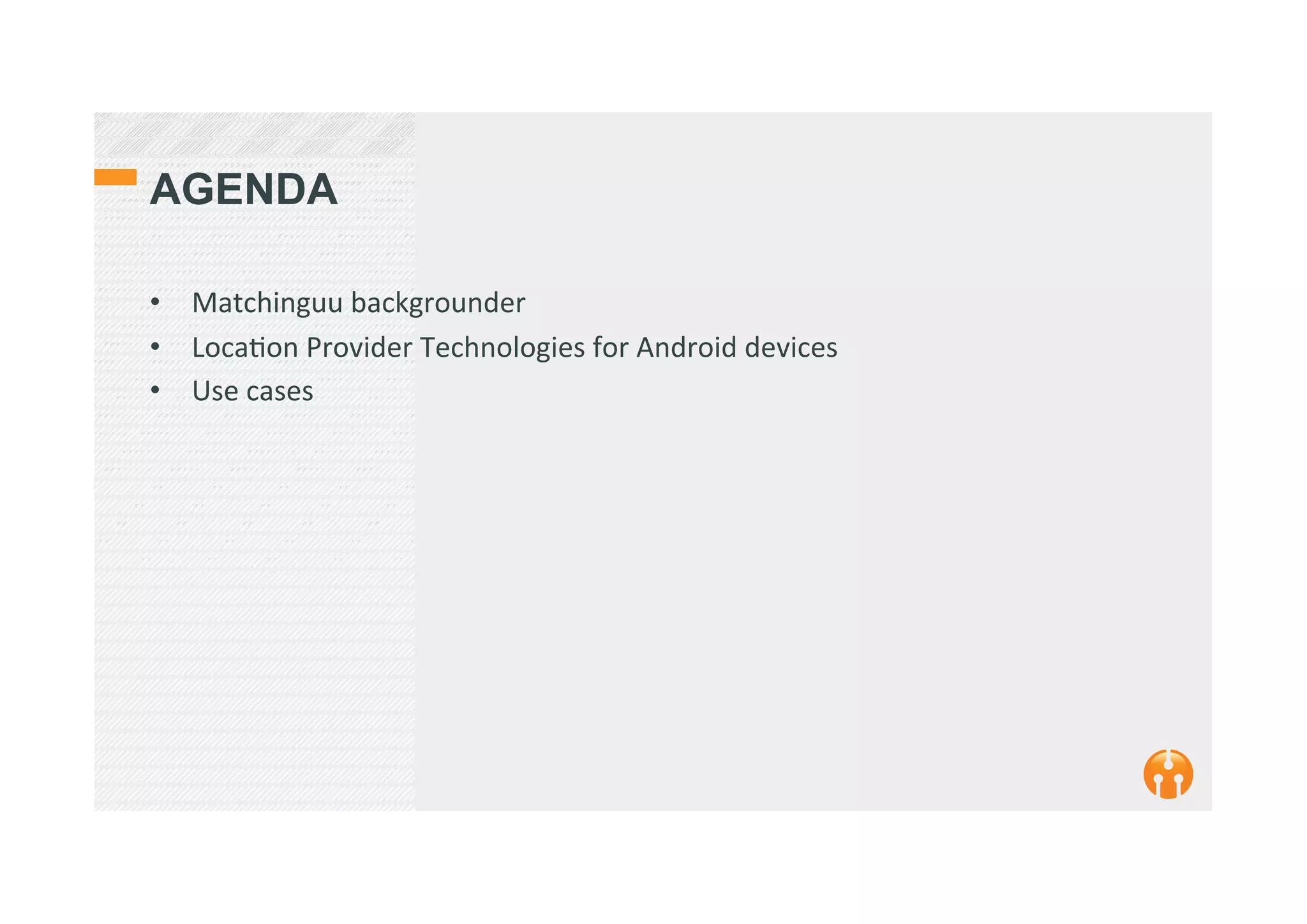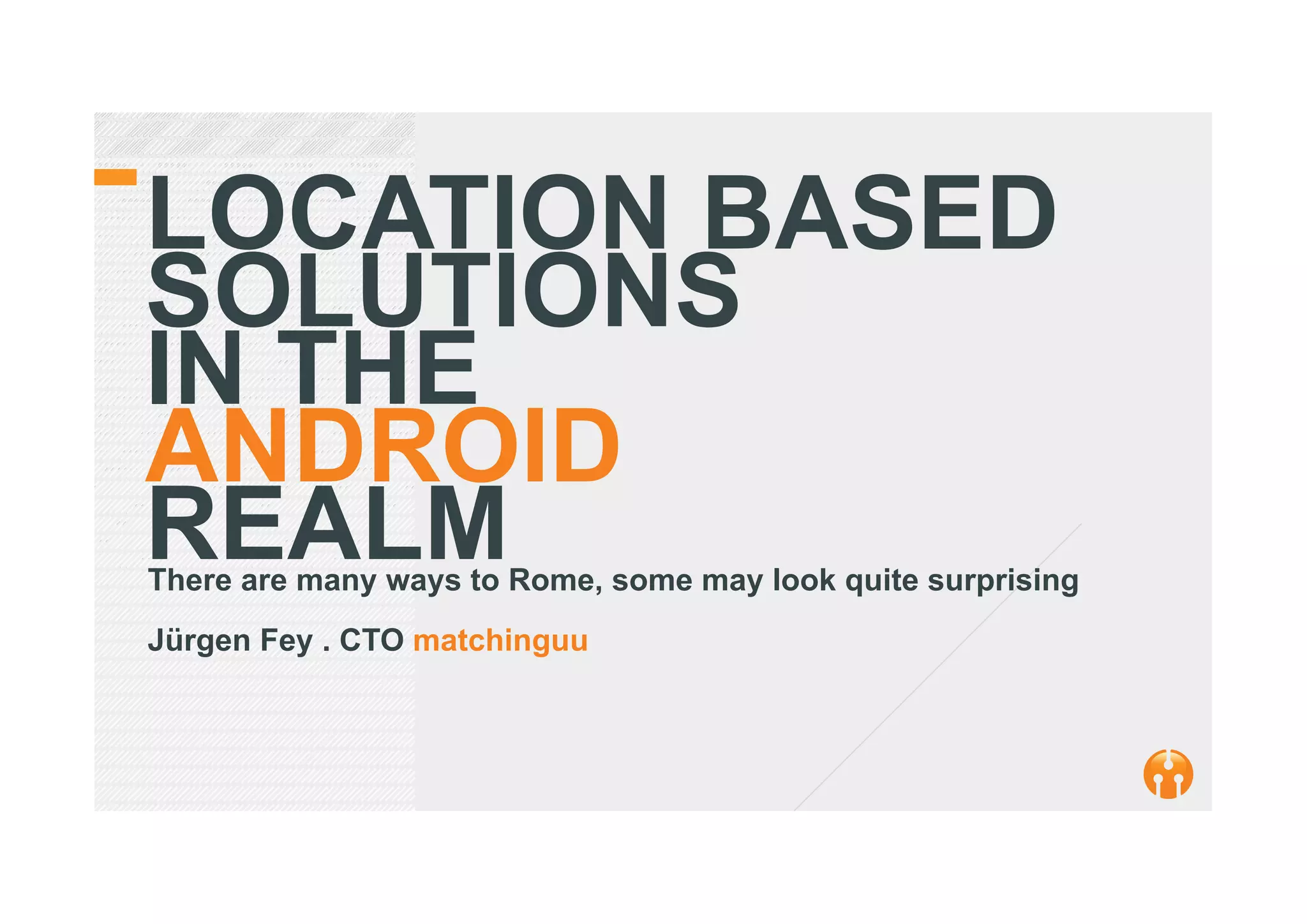 Matchinguu is a startup based in Munich that provides location-based solutions and APIs for Android and iOS devices. Their presentation discusses various location provider technologies available on Android devices, including cell-ID, WLAN, GPS, geohashing, and beacons. They provide services like APIs, backend software, and hardware to help businesses integrate complex location-based scenarios.
