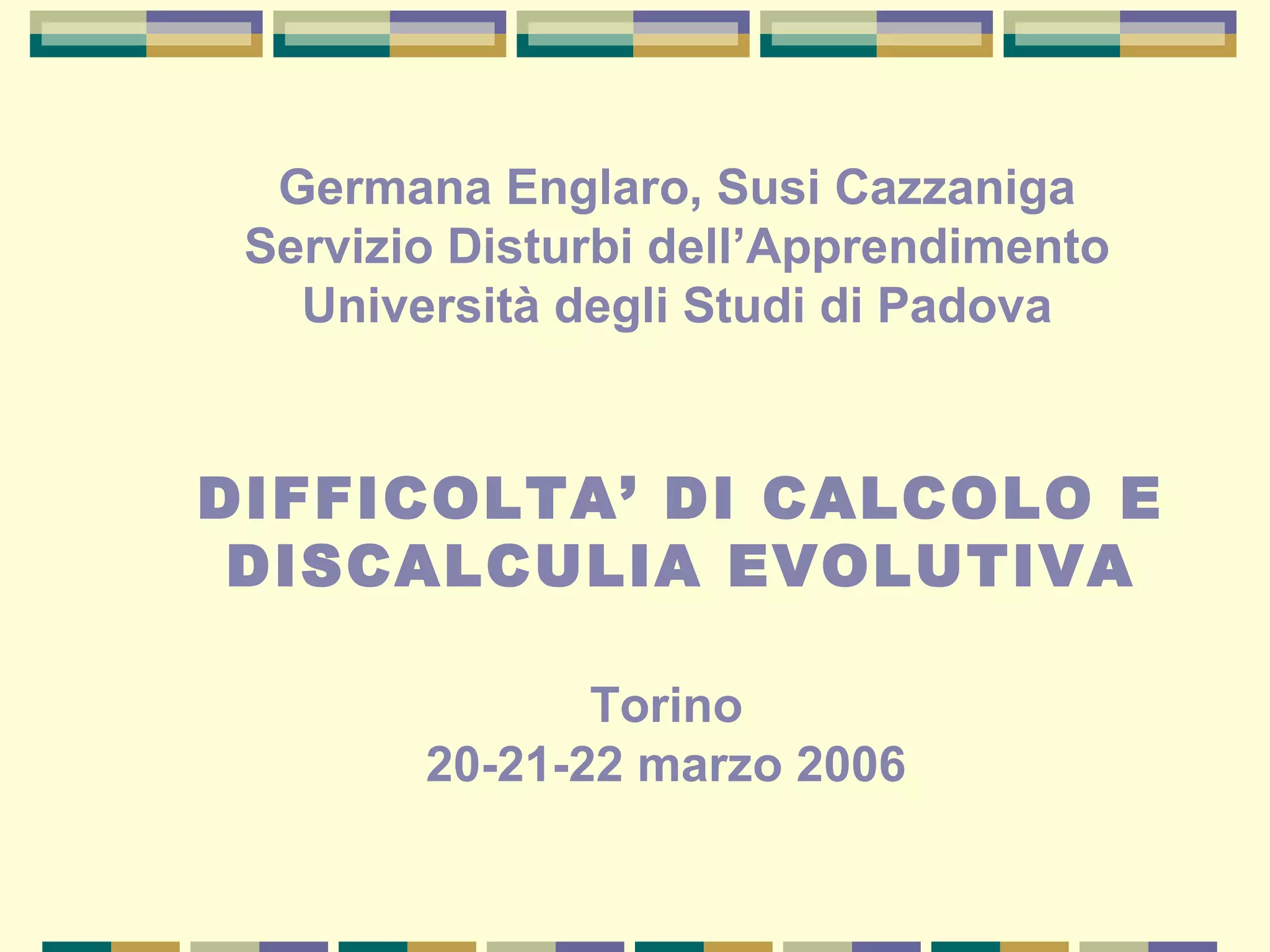 Il documento discute le difficoltà di calcolo e la discalculia evolutiva, evidenziando la presenza di sintomi specifici e la necessità di interventi riabilitativi efficaci. Viene sottolineato che alcuni meccanismi cognitivi e di apprendimento innati influenzano lo sviluppo delle competenze matematiche nei bambini, mentre sono riportati dati sulla prevalenza di difficoltà in matematica nelle scuole. Si concluderà con l'importanza di un approccio didattico che consideri questi aspetti innati per potenziare l'apprendimento.