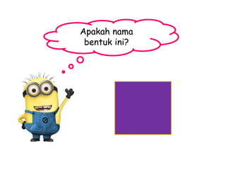 Dokumen ini menerangkan ciri-ciri pelbagai bentuk 2 dimensi termasuk segi empat sama, segi empat tepat, segi tiga, dan bulat. Segi empat sama dan segi empat tepat mempunyai 4 bucu dan 4 sisi lurus, segi tiga mempunyai 3 bucu dan 3 sisi lurus, manakala bulat tidak mempunyai bucu dan mempunyai 1 sisi melengkung. Dokumen mengajak pembaca untuk mengenal pasti contoh-contoh bentuk ini dalam kehidupan seharian.