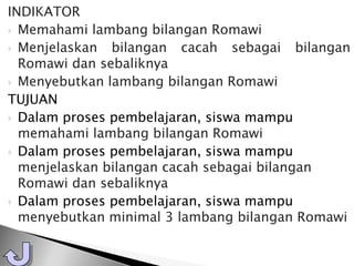 Dokumen ini membahas tentang bilangan Romawi, meliputi pengenalan lambang bilangan Romawi, aturan penjumlahan, pengurangan, dan gabungan bilangan Romawi, serta contoh penerapannya. Tujuan pembelajaran adalah agar siswa dapat memahami lambang bilangan Romawi dan menjelaskan bilangan biasa menjadi bilangan Romawi dan sebaliknya.