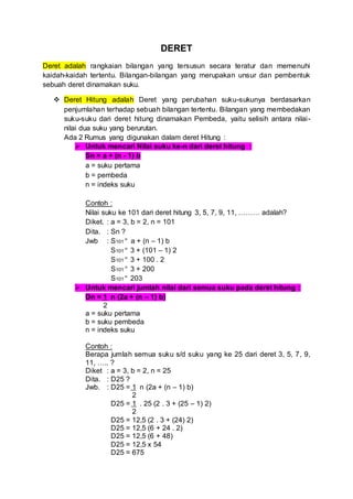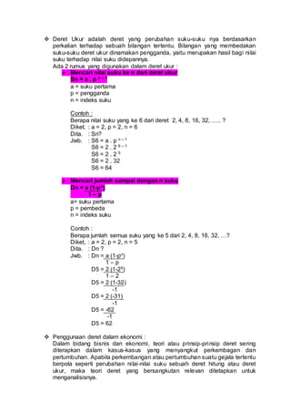 Deret adalah rangkaian bilangan yang tersusun secara teratur dan memenuhi aturan tertentu. Terdapat dua jenis deret, yaitu deret hitung dan deret ukur. Deret hitung memiliki perbedaan suku yang dihitung dengan penjumlahan bilangan tertentu, sedangkan deret ukur memiliki perbedaan suku yang dihitung dengan perkalian bilangan tertentu. Teori deret sering diterapkan dalam bidang ekonomi untuk menganalisis pertumbuhan yang berpol