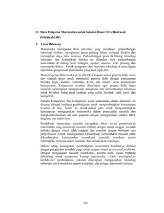 Dokumen tersebut membahas tentang mata pelajaran matematika untuk sekolah dasar yang mencakup tujuan pembelajaran matematika untuk membekali siswa dengan kemampuan berpikir logis, analitis, kritis dan kreatif serta memecahkan masalah. Dokumen ini juga menjelaskan ruang lingkup pembelajaran matematika SD yang mencakup bilangan, geometri, dan pengolahan data serta standar kompetensi dan kompetensi dasar yang harus dicapai