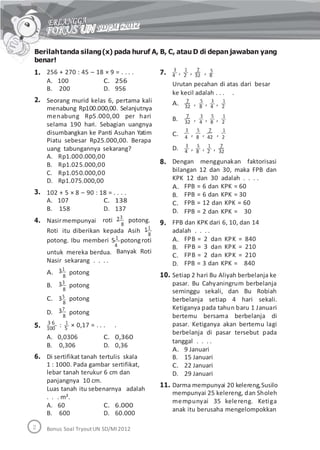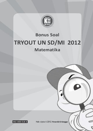 Dokumen ini adalah soal tryout ujian matematika untuk siswa SD/MI tahun 2012 yang mencakup berbagai pertanyaan matematika, termasuk operasi hitung, analisis data, dan konsep geometri. Setiap soal disertai dengan pilihan jawaban yang diharapkan untuk membantu siswa dalam persiapan ujian. Selain itu, terdapat juga bonus soal yang berkaitan dengan berbagai topik matematika.