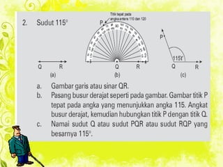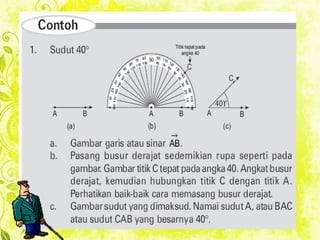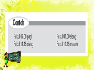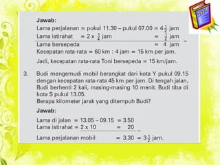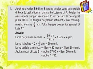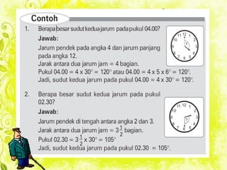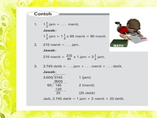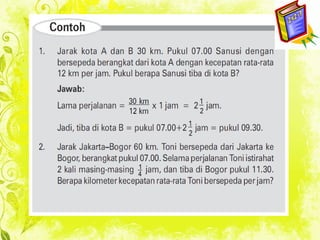 Dokumen ini menjelaskan tujuan pembelajaran untuk matematika kelas 5 mengenai pengukuran waktu, sudut, jarak, dan kecepatan. Siswa diharapkan dapat mengenal dan melakukan operasi satuan waktu, mengukur sudut dengan busur derajat, serta memecahkan masalah yang melibatkan waktu, jarak, dan kecepatan. Selain itu, terdapat penjelasan mengenai notasi waktu 12 dan 24 jam, serta konversi antara berbagai satuan ukuran.