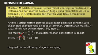 skalar atau bilangan yang disebut determinan. Determianan matriks A