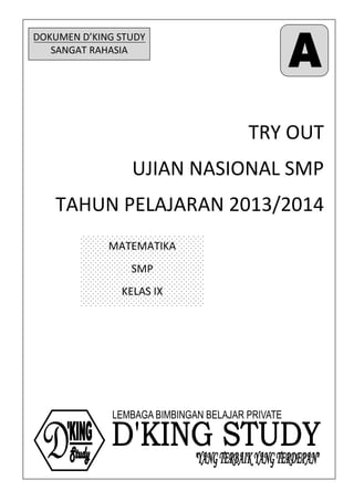 Dokumen tersebut berisi soal-soal ujian nasional matematika untuk siswa kelas IX SMP. Terdapat 50 soal pilihan ganda yang mencakup materi-materi seperti operasi hitung, persamaan dan pertidaksamaan, bangun datar dan ruang, statistik dan peluang.