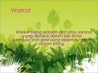 Warkat kliring adalah alat pembayaran yang digunakan dalam sistem kliring perbankan. Beberapa jenis warkat kliring antara lain cek, bilyet giro, surat bukti penerimaan transfer, wesel bank untuk transfer, nota debit, dan nota kredit. Setiap jenis warkat kliring memiliki syarat dan ketentuan tersendiri.