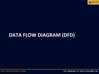 Dokumen tersebut membahas tentang Data Flow Diagram (DFD) yang merupakan alat perancangan sistem berorientasi pada alur data dengan konsep dekomposisi. DFD digunakan untuk menggambarkan proses bisnis dan hubungannya dengan data, serta terdiri atas diagram konteks, diagram level 0, 1, 2, dan seterusnya. Dokumen ini juga menjelaskan elemen-elemen pembentuk DFD seperti proses, data store, aliran data, serta cara menggamb