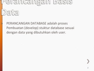 Perancangan database adalah proses pembuatan struktur database sesuai kebutuhan informasi user. Terdiri dari 6 langkah yaitu identifikasi kebutuhan, perancangan konseptual, skema berbagai tingkatan, penerjemahan skema ke struktur database, transfer data, dan pemeliharaan.