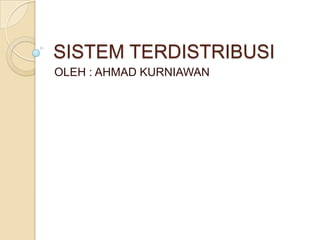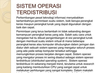 Dokumen ini membahas sistem operasi terdistribusi yang muncul dari perkembangan teknologi informasi untuk mengatasi keterbatasan perangkat keras. Sistem ini memungkinkan pengolahan data secara paralel dan meningkatkan reliabilitas serta efisiensi melalui penggunaan node yang terhubung dalam jaringan. Manfaatnya mencakup berbagi sumber daya, waktu komputasi yang lebih cepat, dan komunikasi antar perangkat dalam berbagai sistem.