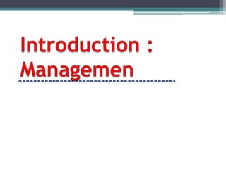 Dokumen tersebut membahas tentang pengantar manajemen farmasi yang mencakup pengertian manajemen, fungsi-fungsi manajemen seperti perencanaan, pengorganisasian, pengarahan, dan pengendalian serta prinsip-prinsip dasar dalam melaksanakan kegiatan manajemen farmasi.
