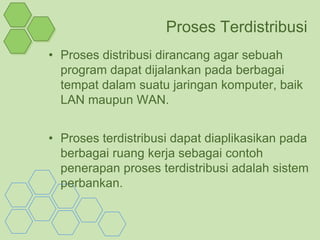 Dokumen tersebut membahas tentang proses, objek, dan layanan terdistribusi. Proses terdistribusi memungkinkan program dijalankan di berbagai lokasi jaringan, seperti sistem perbankan. CORBA memungkinkan objek berkomunikasi dengan kirim pesan, COM untuk komunikasi antar aplikasi, dan DCOM untuk objek program antar komputer dalam jaringan. Web service menyimpan data dalam XML untuk diakses sistem lain, dan memiliki requester, provider, serta registry lay