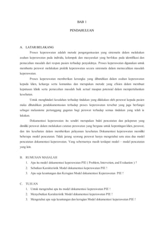 Dokumen ini membahas proses keperawatan sebagai metode sistematis dalam melakukan asuhan keperawatan, serta pentingnya dokumentasi untuk menjaga kualitas dan akurasi informasi. Model dokumentasi keperawatan 'PIE' (Problem, Intervention, Evaluation) dijelaskan dengan karakteristik, keuntungan, dan kerugian, serta prosedur penggunaan dalam praktik. Dokumentasi yang tepat dapat meningkatkan komunikasi antar tenaga kesehatan dan mendukung pengambilan keputusan yang efektif.