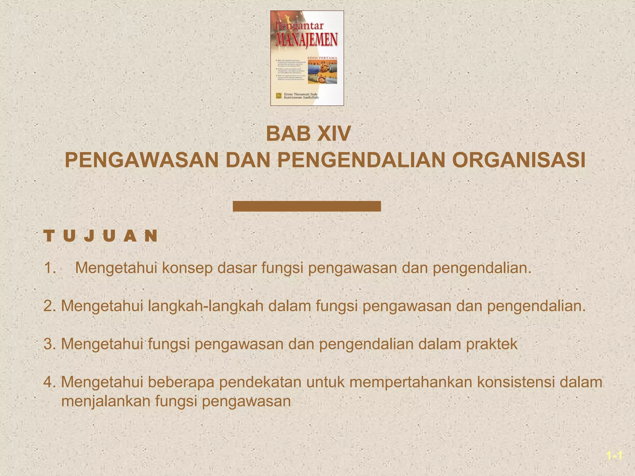 Dokumen ini membahas konsep dasar pengawasan dan pengendalian dalam organisasi, termasuk langkah-langkah dan fungsi yang diperlukan untuk memastikan pencapaian hasil yang diinginkan. Terdapat penjelasan tentang proses pengawasan, gejala yang memerlukan pengawasan, dan penerapan pengawasan di berbagai bidang seperti keuangan, pemasaran, dan produksi. Selain itu, juga dijelaskan berbagai jenis kontrol dalam proses kegiatan pengawasan.